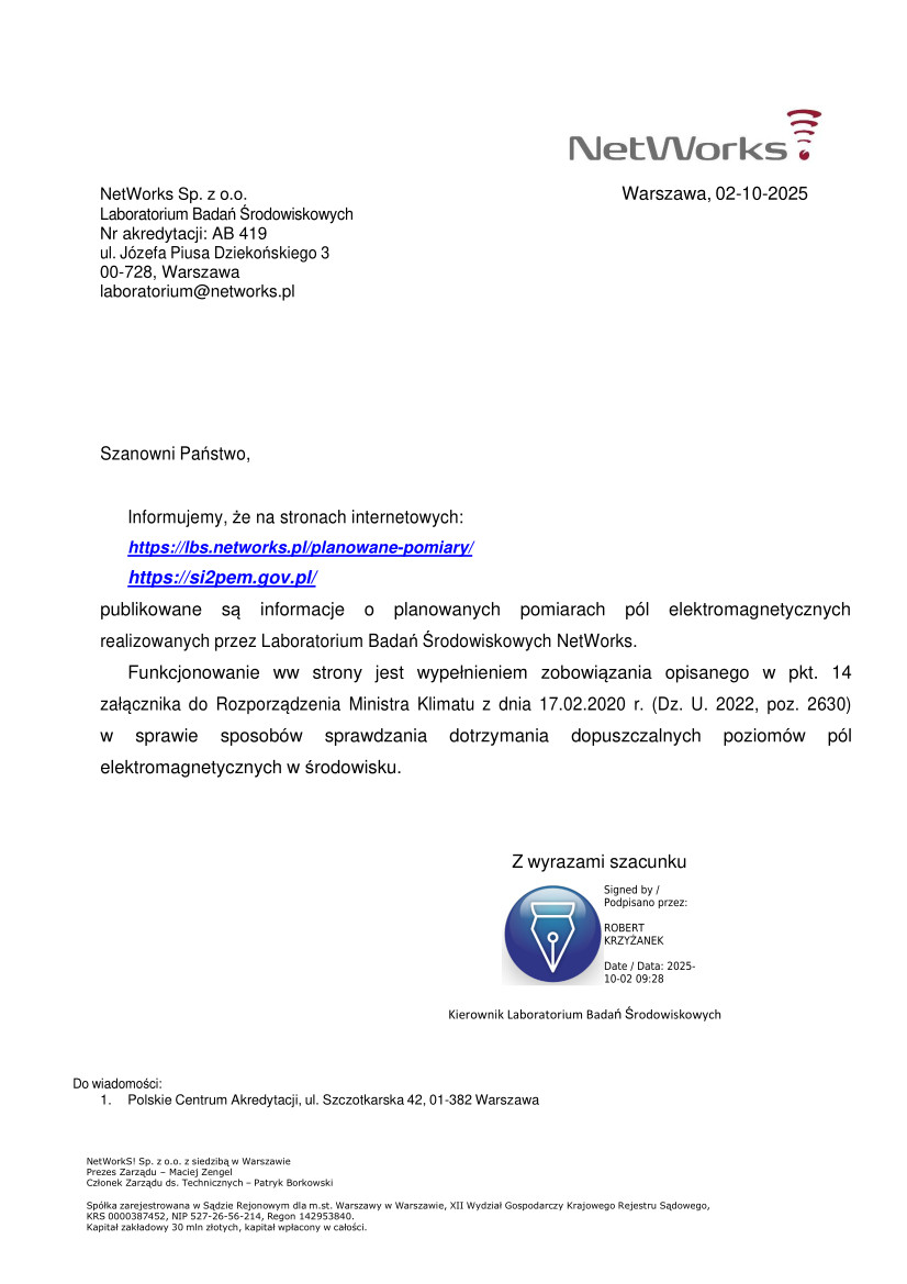 Planowanych pomiarach pól elektromagnetycznych realizowanych przez Laboratorium Badań Środowiskowych NetWorks