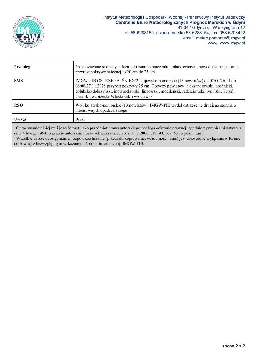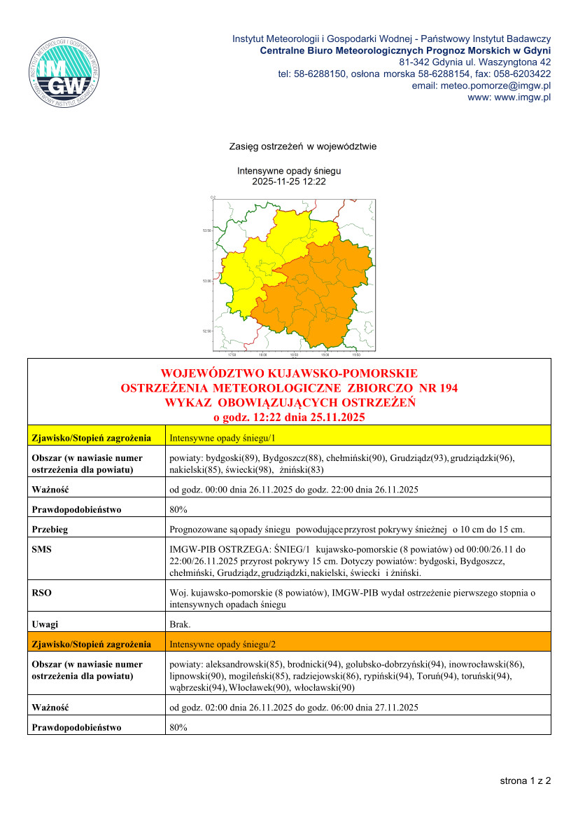Ostrzeżenie meteorologiczne - Intensywne opady śniegu 26.11.2025 - 27.11.2025 !!!