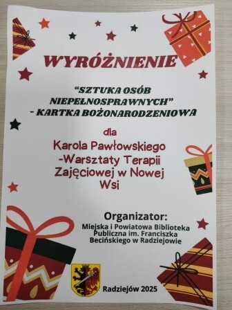 2 grudnia w Miejskiej i Powiatowej Bibliotece w Radziejowie nastąpiło rozstrzygnięcie konkursu na kartkę bożonarodzeniową w ramach kolejnej edycji Powiatowego Konkursu dla Osób Niepełnosprawnych „Sztuka Osób Niepełnosprawnych”, który zawsze ma na celu docenienie i pokazanie twórczości artystycznej osób z niepełnosprawnościami. Każdy artysta – uczestnik konkursu włada w swoją pracę mnóstwo wysiłku i serca, stąd też trudno zawsze orzec czyje dzieło najpiękniejsze. Dlatego też nie przydzielono żadnych miejsc, ale nagrodzono wielu artystów wyróżnieniami. Wśród nich znalazł się nasz uczestnik Karol Pawłowski z pracowni komputerowo-biurowej za swoją kartkę z choinką quillingową. Gratulacje.