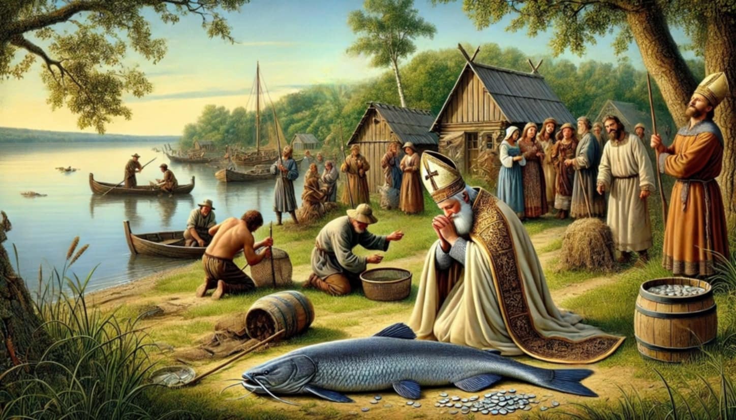 Kiedy dzielono mięso wielkiego suma, w jego trzewiach nie barana znaleziono lecz okutą beczułkę. Zaskoczeni rybacy rozbili drewniana baryłkę, z której wypłynęły srebrne monety, zausznice, kabłączki, lunule, naszyjniki, kaptorga nawet. Prawdziwy skarb. Uradowani mieszkańcy osady wołać poczęli w stronę biskupiego orszaku: