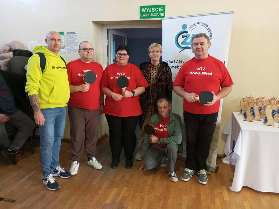 21 października br. grupa naszych uczestników – Arleta, Arek, Darek i Krzysztof – wraz z opiekunami wzięli udział w I Białobłockich Mistrzostwach Tenisa Stołowego Osób Niepełnosprawnych „Zagraj z ZAZ-em”. Do tenisowych rozgrywek stanęło ok. 70 zawodników z różnych placówek dla osób niepełnosprawnych z terenu województw kujawsko -pomorskiego i wielkopolskiego. Swoją postawą udowodnili, że tenis to kolejna dyscyplina sportowa, w której są w stanie przekroczyć granice własnych słabości i sięgać po świetne wyniki. Nasi tenisiści, choć nie stanęli na podium, to dzielnie rozgrywali kolejne partie. Najdłużej przy stole tenisowym utrzymywał się Krzysztof Maciołek i dzięki temu znalazł się w pierwszej dziesiątce najlepszych. Dziękujemy Organizatorom - ZAZ-owi „Ośrodek Sportu i Rehabilitacji” oraz Stowarzyszeniu Enigma z Białych Błót za zaproszenie a my już zaczynamy ćwiczyć na następne tenisowe mistrzostwa.