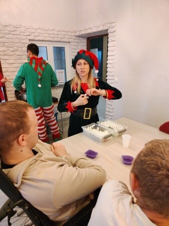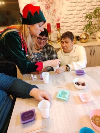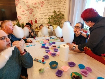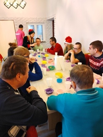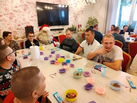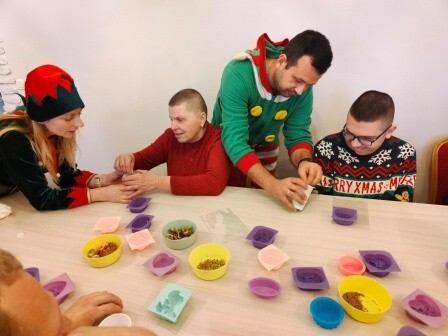 Piątek 5 grudnia był dla naszych uczestników dniem niespodzianek. Wtedy właśnie w Warsztatach gościliśmy grupę animacyjną „Akcja Animacja” z Babiaka. Przyjechali oni na zaproszenie Stowarzyszenia Przekroczyć Granice, by w ramach niespodzianki z okazji Mikołajek przeprowadzić warsztaty robienia mydełek. Zarówno podopieczni jak i opiekunowie naszej placówki z ogromnym zaciekawieniem uczestniczyli w każdym etapie produkcji pachnących mydełek. Był to pokaz pełen wrażeń dotykowych, wizualnych i zapachowych a każdy na koniec mógł zabrać ze sobą na pamiątkę swój wytwór. Jednak to nie był koniec atrakcji, gdyż nagle za oknem ukazała się nam postać Mikołaja, który wpadł do nas na chwilę ze słodkościami. Dopełnieniem szczęścia była porcja waty cukrowej przygotowana dla każdego przez animatorów. Nowe doświadczenia i umiejętności zdobyte podczas robienia mydełek zachwyciły naszych podopiecznych a sympatyczna atmosfera spotkania z grupą „Akcja Animacja” pozostawiła w nas wspaniałe wspomnienia. Dziękujemy Stowarzyszeniu , z panią Prezes Iwoną Łodygowską na czele, za przygotowanie dla naszych uczestników tej „pachnącej” niespodzianki.