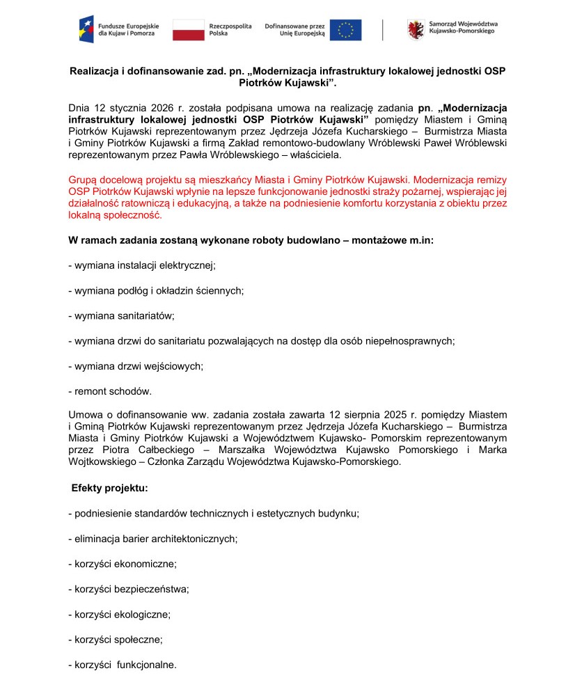 Realizacja i dofinansowanie zad. pn. „Modernizacja infrastruktury lokalowej jednostki OSP Piotrków Kujawski”