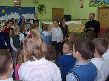 W dalszej części Ksiądz Proboszcz odczytał Ewangelię o narodzeniu Pana Jezusa i pobłogosławił opłatki. Wszyscy wspólnie się pomodlili. Pani Dyrektor złożyła zebranym najlepsze życzenia i zaprosiła do dzielenia się opłatkiem. Cała wspólnota szkolna składała sobie życzenia. Punktem kulminacyjnym uroczystości było spożywanie wieczerzy wigilijnej przygotowanej przez rodziców.