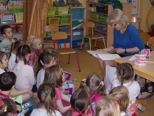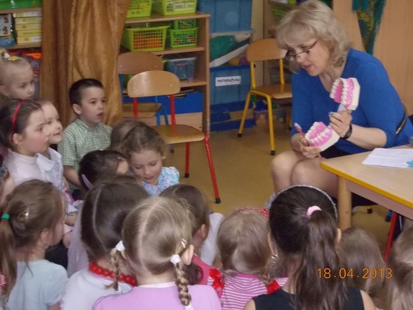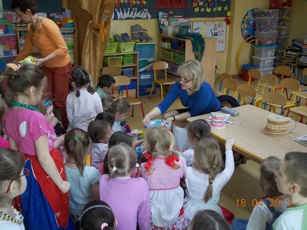 W myśl tego hasła zaprosiliśmy naszych milusińskich na spotkanie z panią stomatolog, a przedszkolaki dowiedziały się, jak dbać o zęby i higienę jamy ustnej. Poznały akcesoria narzędzia potrzebne do pracy w tym zawodzie, rozmawiały o konieczności codziennego dbania o zęby, uczyły się prawidłowego ich szczotkowania. Wspólnie z gościem ustaliły listę produktów zdrowych i szkodliwych dla zębów. Dzieci były bardzo zainteresowane tematem, posiadały dużą wiedzę na ten temat, nie brakowało też pytań. Wysłuchały opowiadania „Pracowitość i porządek”. Na zakończenie spotkania przedszkolaki otrzymały od p. stomatolog książeczek „Ząbków bitwy o zdrowie”. Jednogłośnie obiecały systematycznie kontrolować stan swojego uzębienia. Wszystkie dzieci otrzymały zaproszenie do gabinetu stomatologicznego, zapewnienie, że leczenie nie boli. Dzieci, postanowiły też sprawdzić swoje przybory do mycia zębów, które mają w przedszkolnym kąciku pięknego uśmiechu.