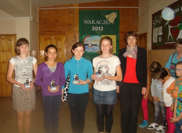 Uczennice, które otrzymały statuetkę „Sowy” za wybitne osiągnięcia w ciągu nauki w Szkole Podstawowej w Dębołęce.