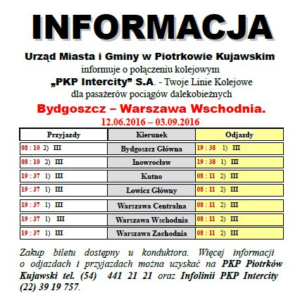 Urząd Miasta i Gminy w Piotrkowie Kujawskim informuje o połączeniu kolejowym „PKP Intercity” S.A. - Twoje Linie Kolejowe dla pasażerów pociągów dalekobieżnych Bydgoszcz – Warszawa Wschodnia.