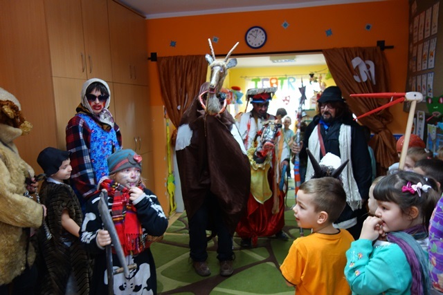 Związane ściśle z przełomem karnawałowo-wielkopostnym, dzieją się u progu życiodajnej wiosny i w istocie swej zawierają akcenty zaklinania urodzaju, zapewnienia dostatku, a przede wszystkim wypędzenia złych mocy a także zimy. Symbolika obrzędu zawierała dwa poziomy działań magiczny i społeczny. Pierwszy z nich odzwierciedlały barwne i głośne korowody zapustnych przebierańców na czele z maszkarami zwierzęcymi, które od "tłustego czwartku", a zwłaszcza we wtorek zapustny obchodziły wsie zbierając datki, składając domownikom życzenia wszelkiej pomyślności, zapraszając przy tym do karczmy na zabawę podkoziołkową, która kończyła czas karnawałowych zabaw. Symbolikę samych postaci podkreślały ich kostiumy, cechujące się kosmatością, która w kulturze ludowej oznaczała bogactwo (słomiany niedźwiedź, słomiane powrósła, opasujące różne postacie, kożuchy wywrócone runem na wierzch). Wśród nich najważniejszą postacią zapustnych korowodów była i jest koza (stąd nazwa zwyczaju: chodzenie z kozą). Ale w pochodzie idą również inne maszkary: koń i bocian, a także śmierć, diabeł, kominiarz, młoda para i wiele innych postaci. Z kozą, jako postacią pierwszoplanową, odgrywano niegdyś scenki - sprzedawano ją domownikom, leczono, gdy ta przewracała się na ziemię. Niegdyś wierzono, że wędrówki kolędników spowodują szybkie nadejście wiosny. Na zakończenie obchodów urządzano w karczmie zabawę, zwaną podkoziołkiem, podczas której dziewczęta wykupywały tańce, rzucając pieniądze pod ustawioną na stołku figurkę koziołka. Tegoroczne ostatki w naszym przedszkolu odbyły się hucznie i wesoło. Grupa Misie zachęcona tradycją po wstępnym teoretycznym zapoznaniu się z obrzędem przebrała się za zapustowe postacie. Był diabeł, bocian, dziad i baba, panna młoda i oczywiście koza. Dzieci tańczyły, robiły hałas i bawiły się przy tym świetnie. Właśnie mieliśmy zacząć odwiedzać każdą z grup aby zebrać nieco datków w postaci słodyczy, gdy nagle do przedszkola zawitał najprawdziwszy zapustny korowód. Zaczęły się wspólne tańce, przedszkolaki przyglądały się barwnym przebierańcom, wymalowanym nie do poznania. Oczywiście był śmiech, ale i łzy ponieważ młodsze dzieci nieco wystraszyły się naszych gości. Koza otrzymała datek na sianko i pożegnawszy się z przedszkolakami ruszyła w dalszą wędrówkę. Mamy nadzieje, ze za rok również do nas zawita.