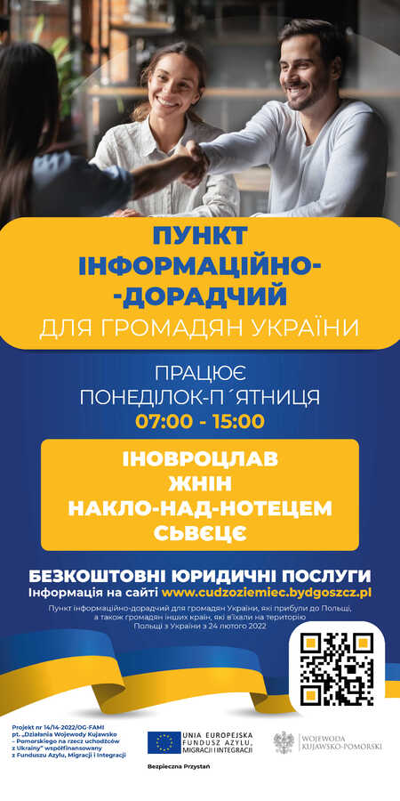 Wojewoda Kujawsko-Pomorski realizuje projekt nr 14/14-2022/OG-FAMI pt. „Działania Wojewody Kujawsko – Pomorskiego na rzecz uchodźców z Ukrainy”. Projekt jest współfinasowany ze środków unijnych.