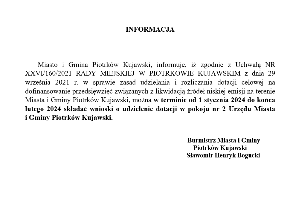 Informacja - w sprawie zasad udzielenia i rozliczenia dotacji celowej na dofinansowanie przedsięwzięć związanych z likwidacją źródeł niskiej emisji na terenie Miasta i Gminy Piotrków Kujawski