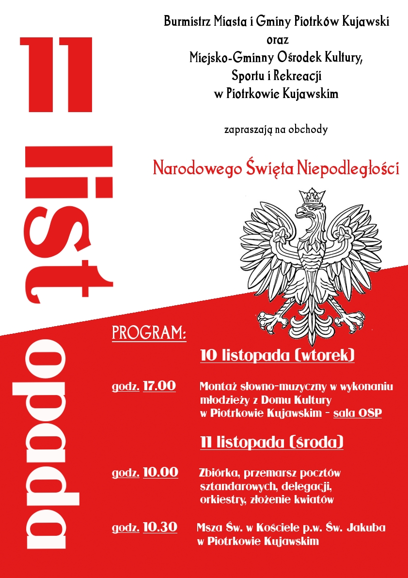 Burmistrz Miasta i Gminy Piotrków Kujawski zaprasza Mieszkańców, delegacje placówek oświatowych, instytucji, stowarzyszeń, gminnych jednostek organizacyjnych na obchody Święta Niepodległości 11 listopada.