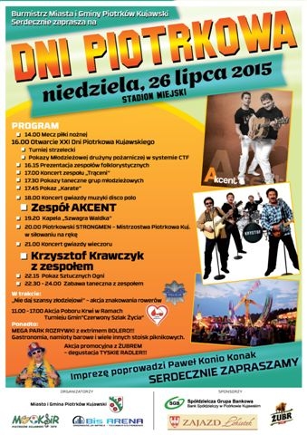 Burmistrz Miasta i Gminy Piotrków Kujawski- Sławomir Henryk Bogucki serdecznie zaprasza wszystkich mieszkańców i gości na Dni Piotrkowa Kujawskiego 2015 w niedzielę 26 lipca.